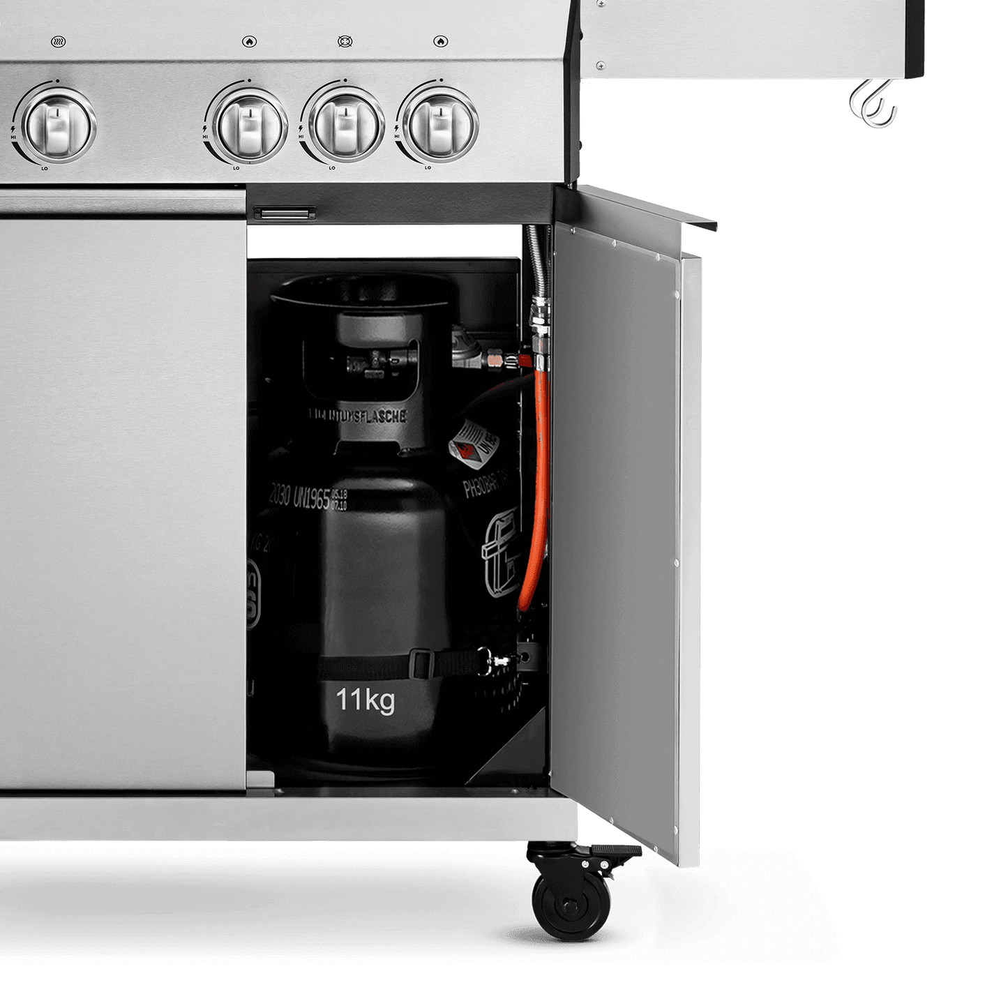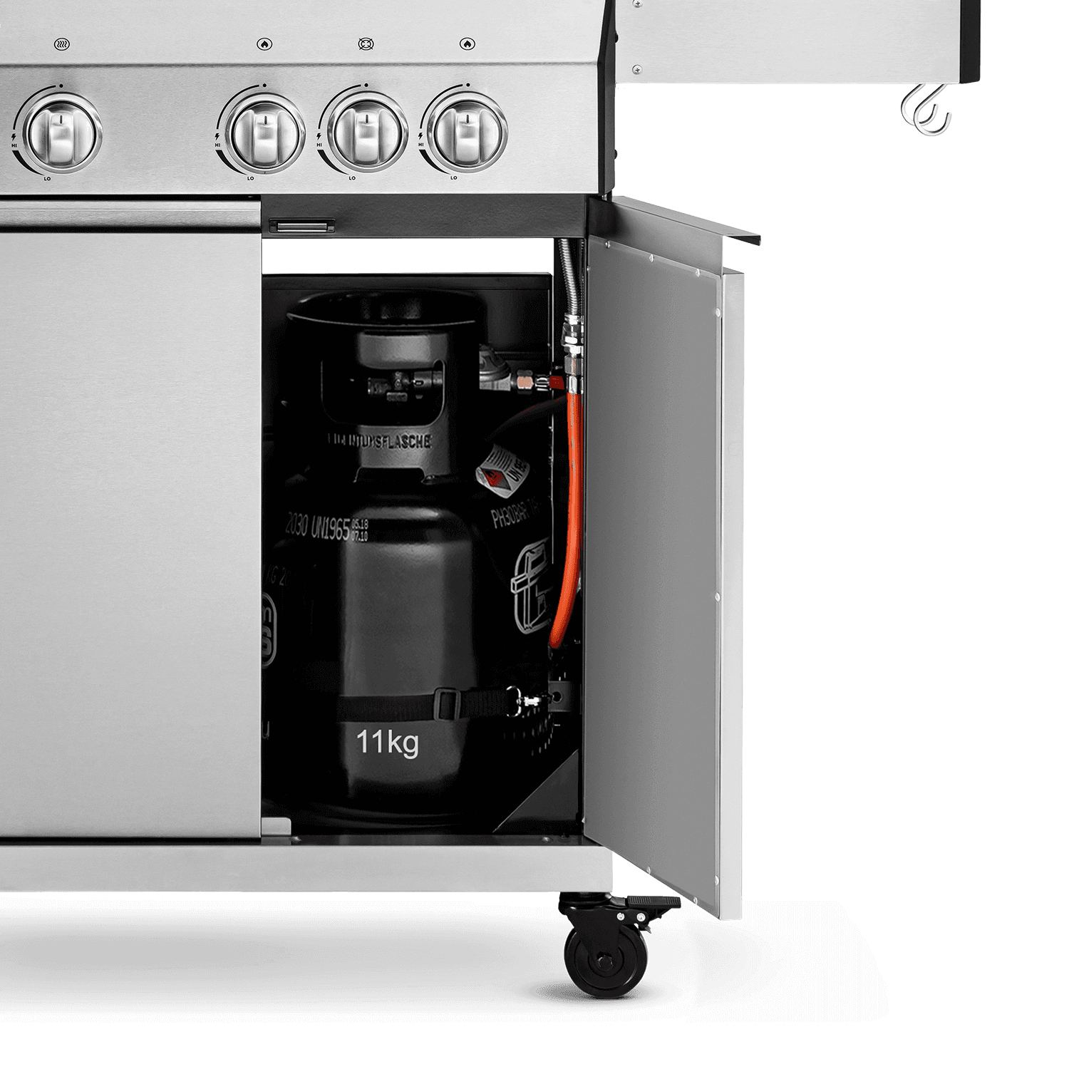 Im Stauraum im Korpus kannst du dein Grillzubehör griffbereit aufbewahren oder selbst die große 11 kg Gasflasche anschließen, verwenden und dauerhaft verstauen.