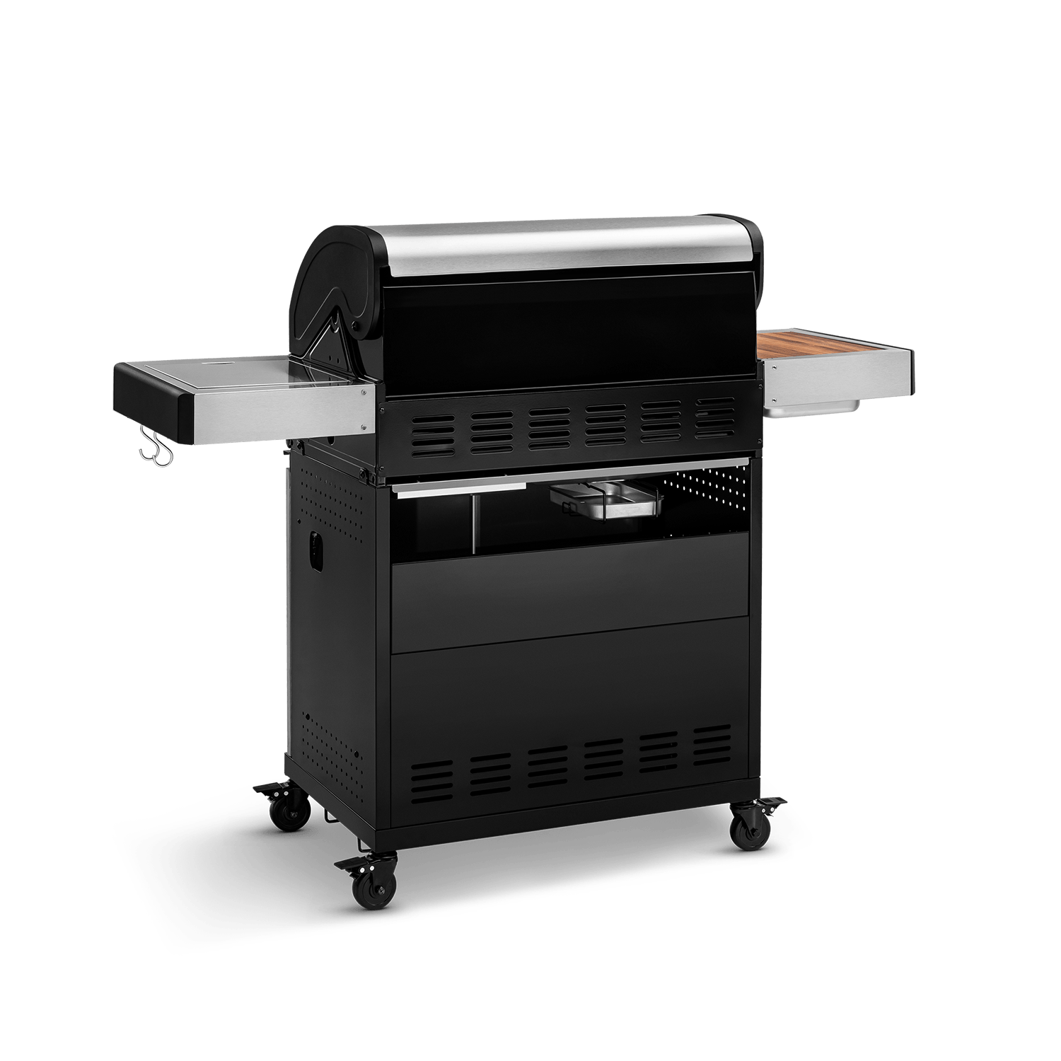 Brennkammer & Korpus: 100 % Edelstahl. Klappbare Seitentische und viel Stauraum.