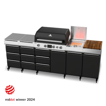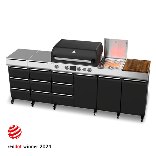 Vier Seitenschränke mit extra Stauraum und ein seitlicher XXL Infrarot-Keramikbrenner bringen maximale Funktion und Performance auf deine Terrasse.